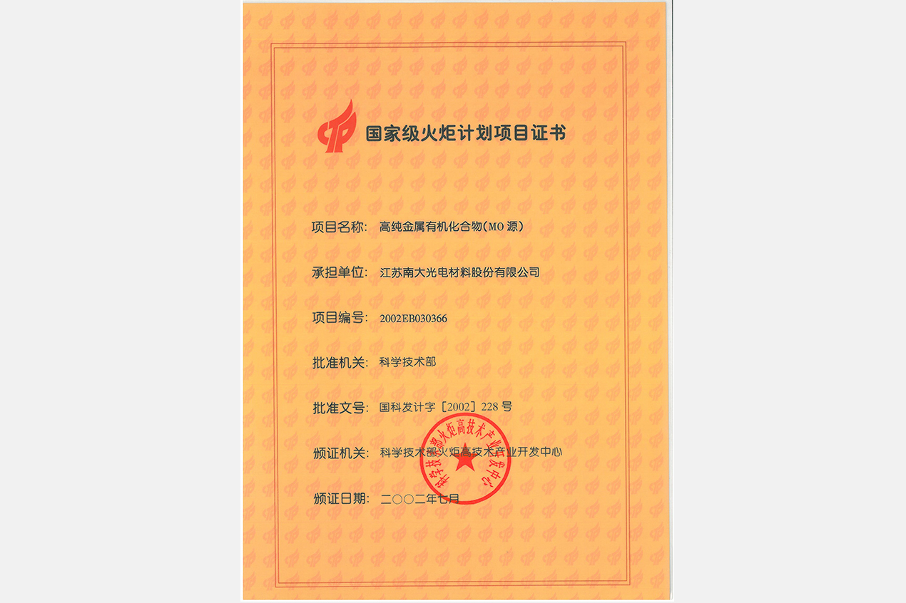 高純金屬有機(jī)化合物(MO源)獲得科技部頒發(fā)的“國(guó)家級(jí)火炬計(jì)劃項(xiàng)目證書(shū)”。